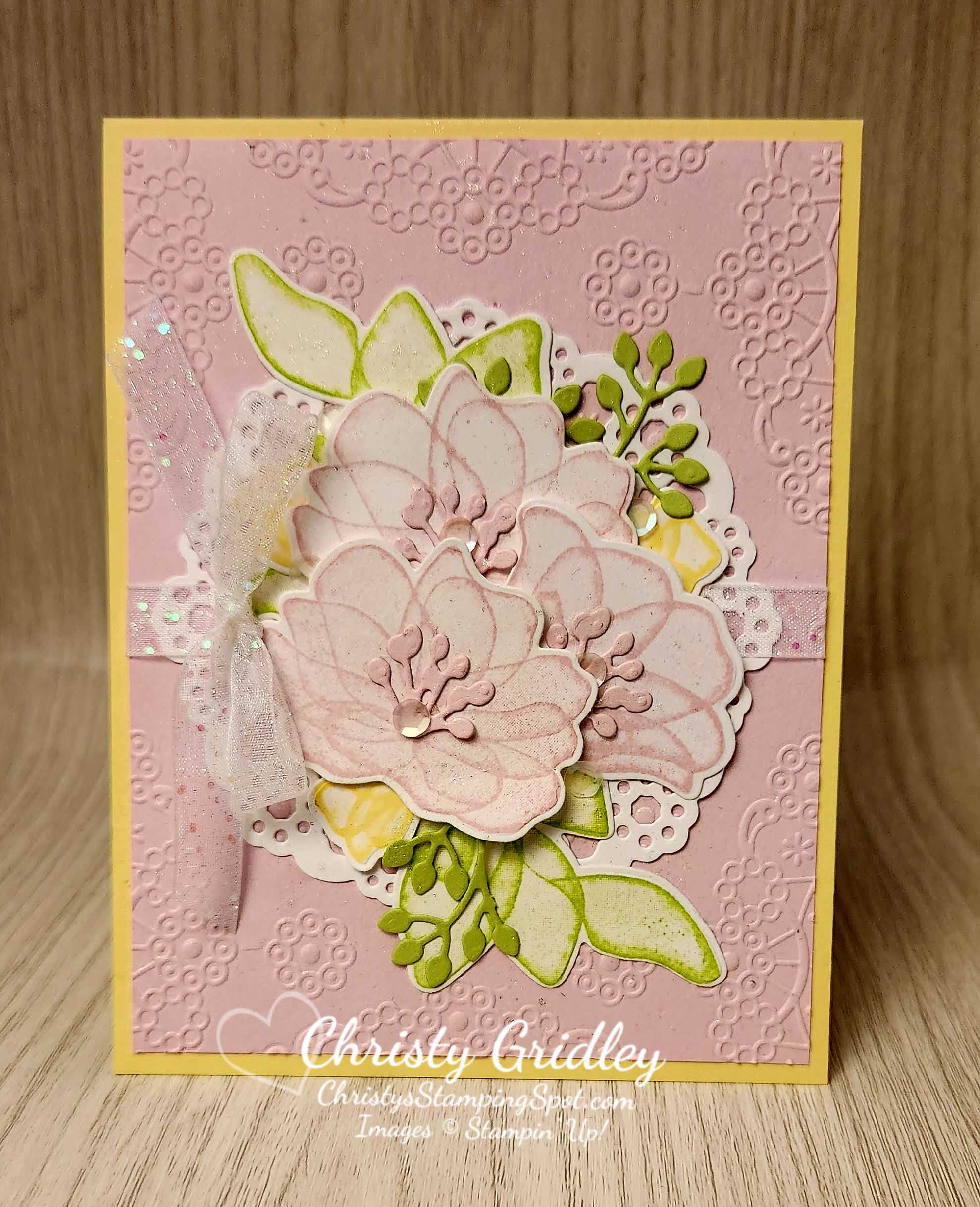 For this week’s Global Design Project color challenge I created a lovely floral card using the upcoming September–December 2023 Mini Catalog Translucent Florals bundle with the Delightful Doily Hybrid Embossing Folder & Dies and the Textured Floral dies. Start with Lemon Lolly cardstock card base. Cut Bubble Bath cardstock panel…