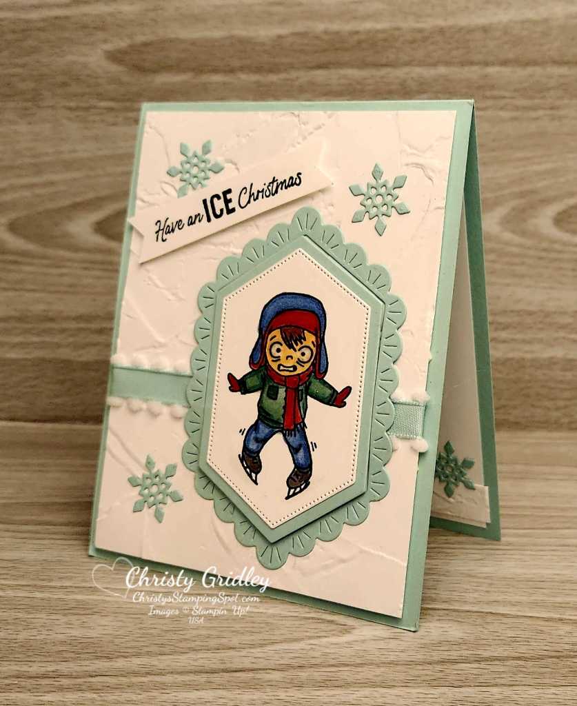Die cut a Pool Party cardstock scalloped frame & label and a Basic White stitched label with the Wildflower Designs dies. Stamp the ice skating little boy image from the Dear Santa stamp set in Memento Black ink on the die cut stitched Basic White label. Color the little boy image with Stampin’ Blends and add Wink of Stella for sparkle. Use glue to add the Pool Party cardstock scalloped frame to the right side of the card front overlapping the wrapped ribbon. Glue the stamped stitched label to the Pool Party cardstock label layer and then add the built label into the center of the scalloped frame with Stampin’ Dimensionals.